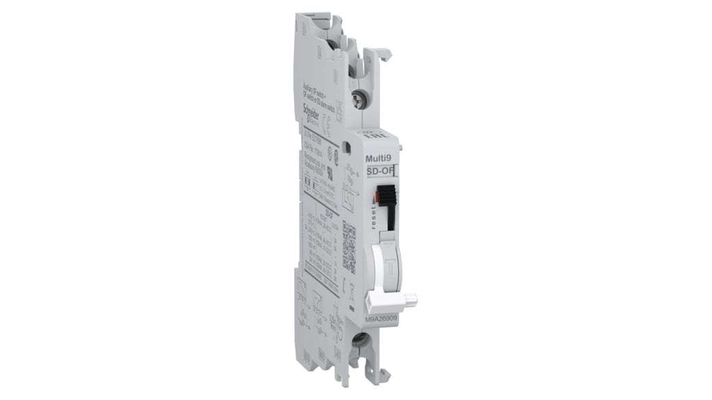 Contatto ausiliario modulare per guida DIN, 2 contatti C/O, montaggio a clip, corrente nominale 6 A, tensione nominale 250 V, grado di protezione IP20, grado di inquinamento 3, temperatura operativa da -25 a 70 gradi Celsius, collegamento con morsetto a vite. Prodotto della serie M9A, codice costruttore M9A26909, marchio Schneider Electric.