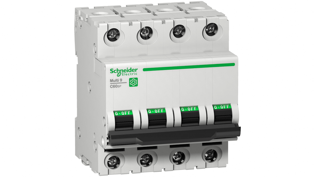 Interruttore automatico miniaturizzato a bassa tensione, 4 poli, 16A, curva di attivazione Tipo D, tensione nominale 277V, gamma Multi9, montaggio su guida DIN, colore grigio. Progettato per proteggere apparecchiature da cortocircuiti e sovraccarichi, dedicato a produttori di apparecchiature originali e costruttori di pannelli di controllo. Codice costruttore M9F23416, marchio Schneider Electric.