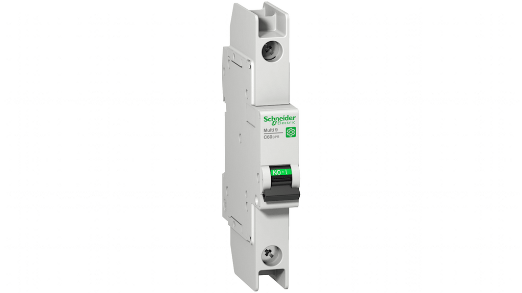 Interruttore automatico miniaturizzato a bassa tensione, 1 polo, 1A, curva di attivazione C, tensione nominale 277V, gamma Multi9, montaggio su guida DIN, colore grigio. Progettato per proteggere apparecchiature da cortocircuiti e sovraccarichi, dedicato a produttori di apparecchiature originali e costruttori di pannelli di controllo. Codice costruttore M9F52101, marchio Schneider Electric.