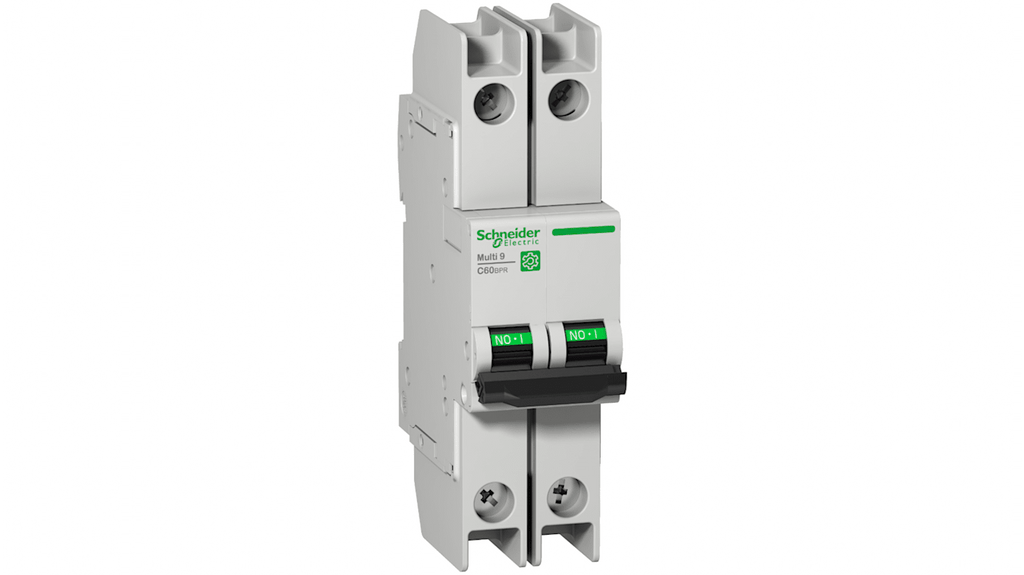 Interruttore automatico miniaturizzato a bassa tensione Multi9, 2 poli, 1A, Tipo C, tensione nominale 277V, montaggio su guida DIN, colore grigio. Progettato per proteggere apparecchiature da cortocircuiti e sovraccarichi, dedicato a produttori di apparecchiature originali e costruttori di pannelli di controllo. Codice costruttore M9F52201, marchio Schneider Electric.
