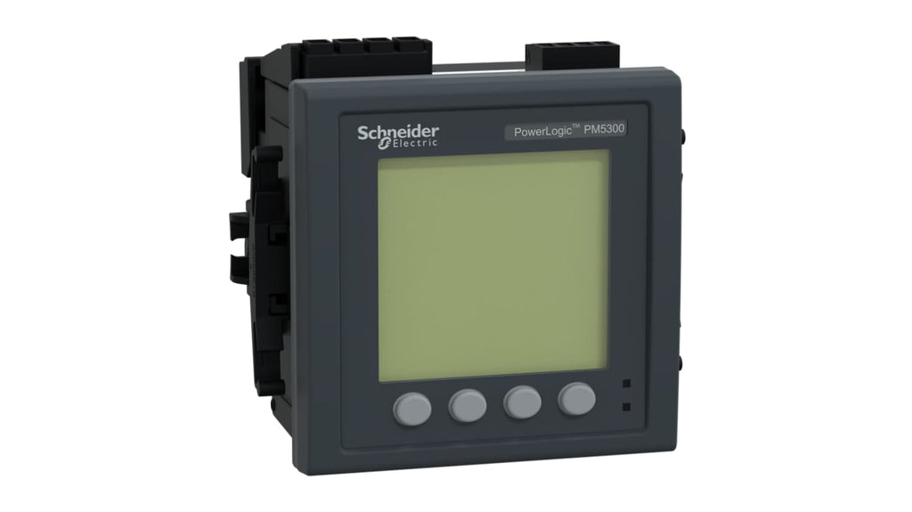 Contatore di energia Schneider Electric PM5330, 1-3 fasi, display LCD retroilluminato, tensione di alimentazione 100-415 V, montaggio su guida DIN, misurazione di tensione, corrente, potenze, valori energetici, applicazioni multi-tariffa, funzionalità master Modbus, temperatura operativa -25 a 70 gradi Celsius, grado di protezione IP52, IP30.