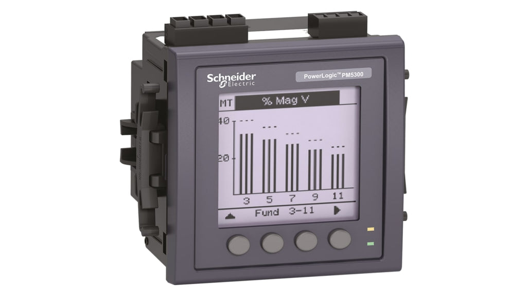 Contatore di energia trifase Schneider Electric, PM5000, display LCD. Dimensioni 96 x 96 mm, profondità 90 mm. Precisione misuratore ±0,5%. Monitoraggio simultaneo di tre fasi, neutra e messa a terra. Uscita impulsi disponibile. Funzionalità di misurazione per gestione costi e sub-fatturazione. Installazione semplice con clip, senza utensili. Certificazione di fatturazione globale. Temperatura operativa da -25 a 60 gradi Celsius. Menu multilingue e grafico.