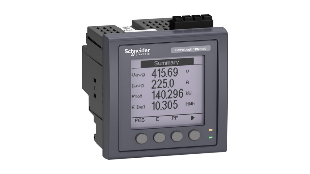 Contatore di energia Schneider Electric PM5561, 1-3 fasi, display LCD retroilluminato, tensione di alimentazione 100-480 V, montaggio su guida DIN, misurazione di tensione, corrente, potenze, valori energetici, applicazioni multi-tariffa e sub-fatturazione, gateway master Modbus, temperatura operativa -25 a 70 gradi Celsius, grado di protezione IP52 e IP30.