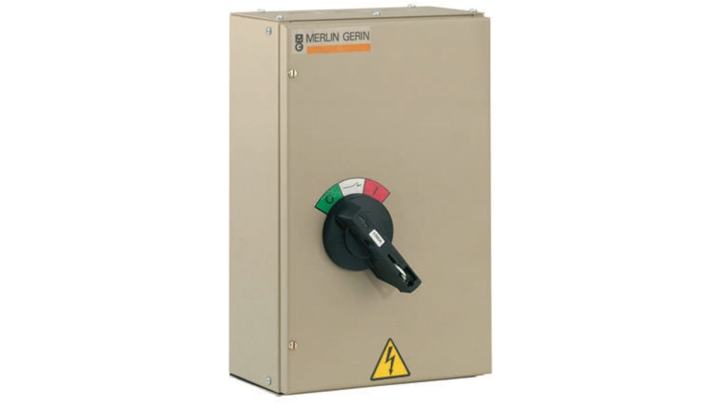Sezionatore con interruttore Schneider Electric, corrente massima 100A, 3 + N, fusibile A2, A3, A4, progettato per applicazioni industriali e commerciali. Contenitore metallico, manopola rotante per indicazione stato, valori nominali 240-415V, kit di collegamento a terra incluso, facile installazione, neutro escludibile, capacità di 3 cavi in uscita, pressacavi rimuovibili, bloccaggio sportello con dispositivo di sblocco. Conforme a standard BS EN 60947-3.