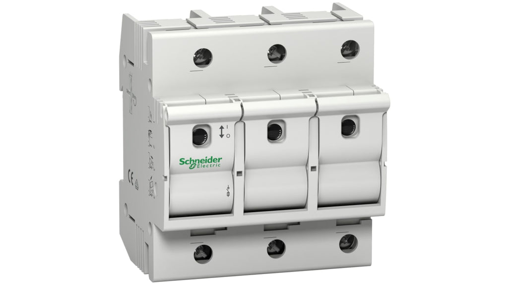 Sezionatore con fusibili della serie Acti9 di Schneider Electric, 3 poli, corrente massima 63 A, tensione di funzionamento 400 V c.a., fusibile 15 x 36 mm, temperatura operativa da -5 a 40 gradi Celsius, grado di protezione IP20, morsetto a vite. Codice costruttore MGN02363.