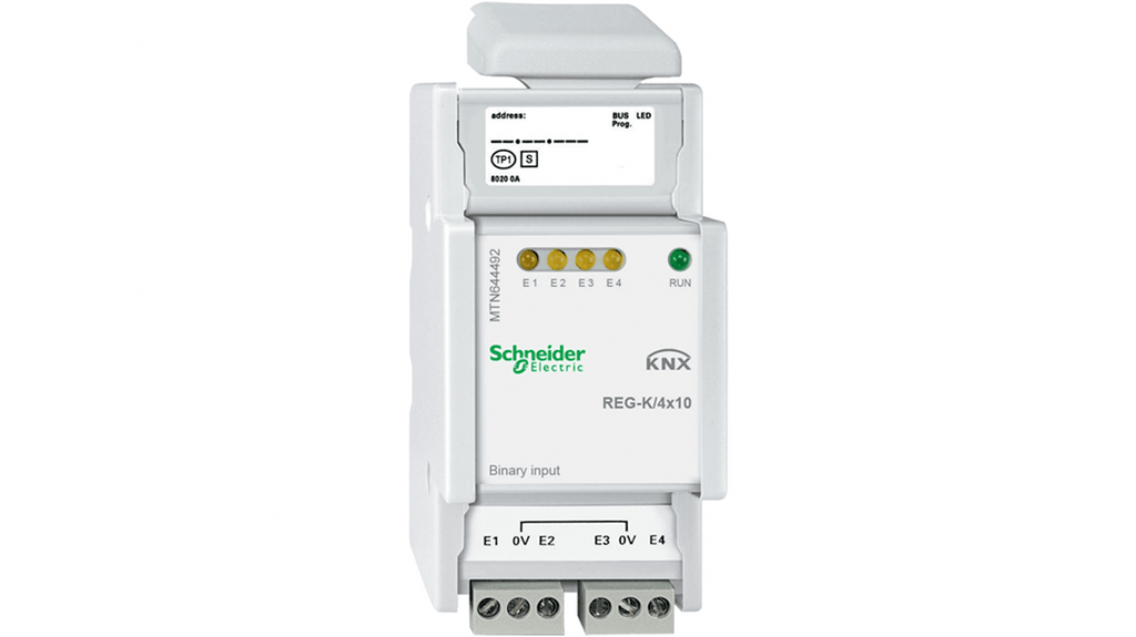 Contatore di energia Schneider Electric, KNX, codice MTN644492. Ingressi binari KNX, 4 ingressi, tensione di segnale in uscita, design compatto 2,5 moduli da 18 mm, montaggio su guida DIN, LED di segnalazione locale, conforme alla direttiva RoHS dell'UE. Prodotto Green Premium, garantisce sostenibilità e sicurezza ambientale.