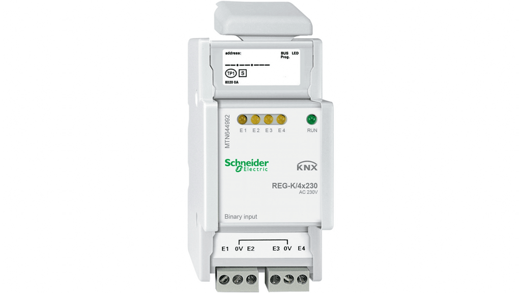 Contatore di energia Schneider Electric, progettato per sistemi bus KNX, codice MTN644992. Include 4 ingressi binari con segnalazione locale a LED, tensione nominale 230 V AC 50 Hz, grado di protezione IP20. Realizzato in materiale ecologico, conforme alla direttiva RoHS dell'UE e alla normativa RoHS della Cina. Dimensioni 2,5 moduli da 18 mm, colore grigio chiaro.
