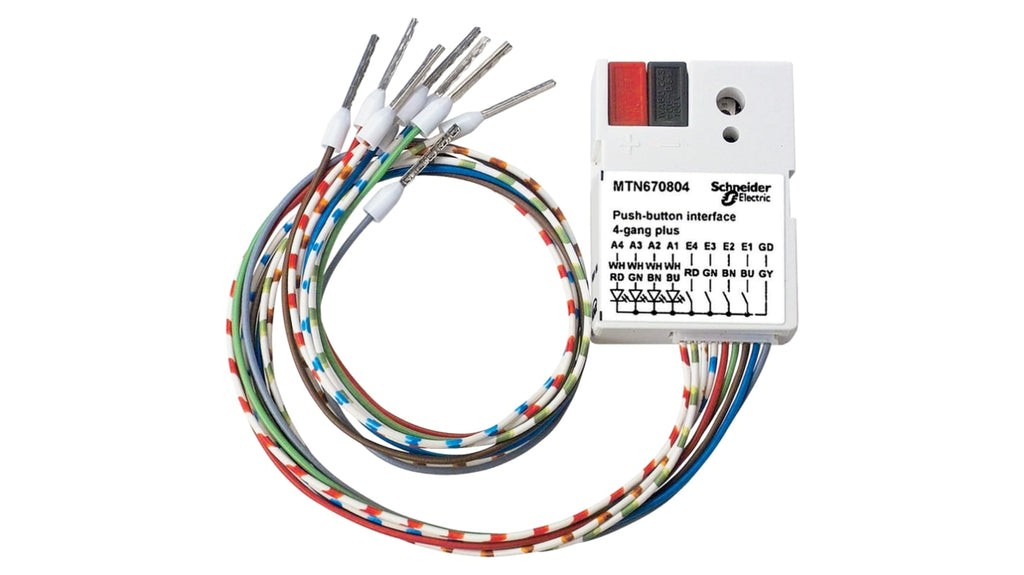 Pulsante Schneider Electric, montaggio a pannello, IP20. Interfaccia a 4 moduli plus, genera tensione di segnale interna per 4 pulsanti convenzionali o contatti flottanti e per 4 LED a bassa corrente. Colore bianco, certificato Green Premium, senza metalli pesanti tossici e senza mercurio. Codice produttore MTN670804, serie KNX.