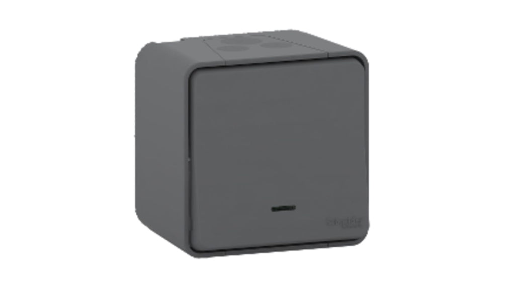 Interruttore di controllo a due vie con montaggio superficiale, Mureva Styl, colore grigio, protezione IP55. Dimensioni forature pannello: larghezza 76mm, altezza 64mm. Prodotto di Schneider Electric, codice MUR35024.