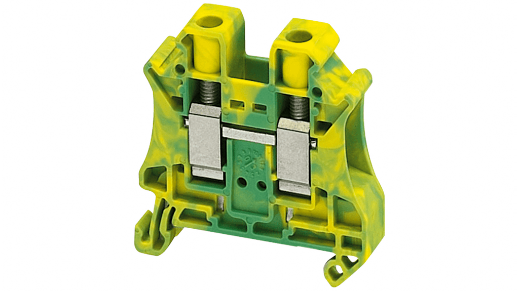 Morsettiera di terra Schneider Electric, 2 vie, codice costruttore NSYTRV102PE. Sezione nominale 10 mm², montaggio a clip, terminazione a vite. Colore verde/giallo, certificazione ATEX. Range di temperatura operativa -40 a 130 gradi Celsius. Materiale poliammide.