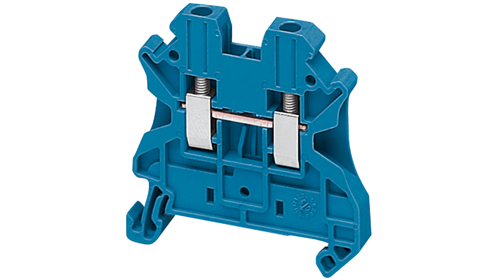 Morsettiera passante a vite Schneider Electric, colore blu, corrente nominale 24A, tensione nominale 1 kV, sezione cavo 2,5 mm², montaggio a clip, materiale poliammide, temperatura operativa da -40 a 130 gradi Celsius, certificazione ATEX. Terminale di livello 1 con 2 collegamenti. Serie TRV.