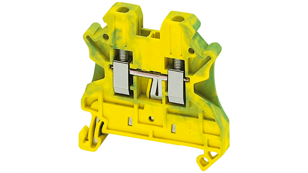 Morsettiera di terra Schneider Electric, 2 vie, codice NSYTRV22PE. Sezione nominale 2,5 mm², montaggio a clip, terminazione a vite. Materiale poliammide, colore verde/giallo. Temperatura operativa -40 a 130 gradi Celsius. Certificazione ATEX per aree pericolose.