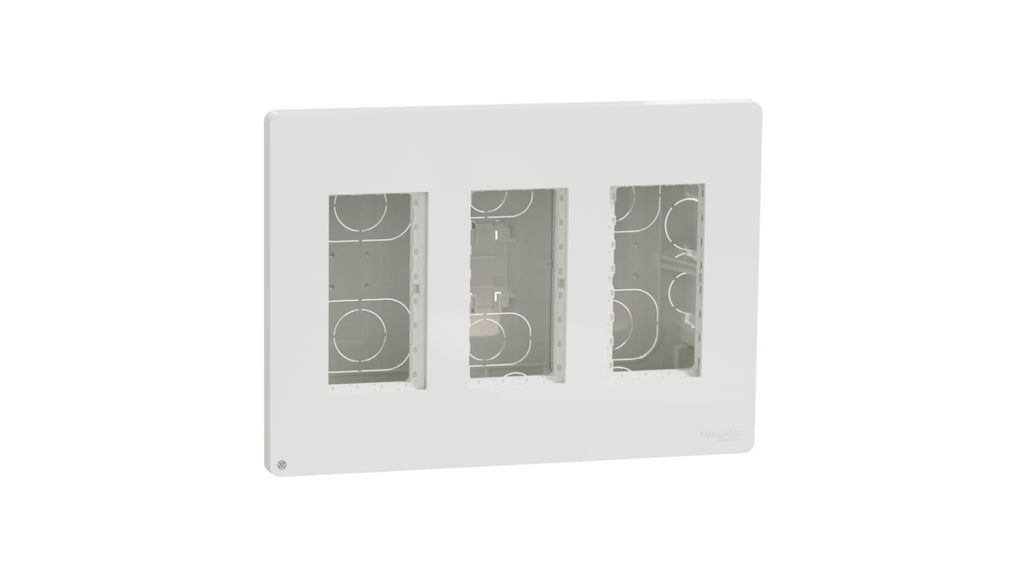 Contenitore stazione di controllo Schneider Electric, progettato per una configurazione a filo, ospita 3 x 4 moduli verticalmente, colore bianco, materiale ABS, resistente ai raggi UV, resistenza al fuoco, grado di protezione IK04, 4 fori, senza marcatura. Ideale per ambienti igienici grazie alla caratteristica antibatterica.