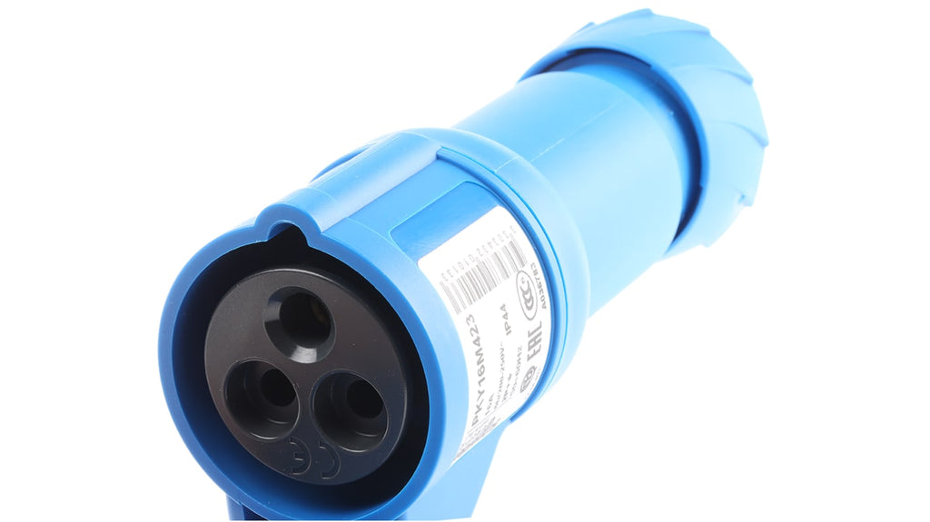 Connettore di alimentazione industriale femmina, 2P + E, corrente nominale 16A, tensione nominale 230 V, montaggio su cavo, grado di protezione IP44, corpo con sistema di apertura e chiusura rapido, fermacavo autocentrante con serracavo, disponibile in colore blu, serie PratiKa. Adatto a molteplici applicazioni industriali, con innesto rapido senza spelamento dei fili.
