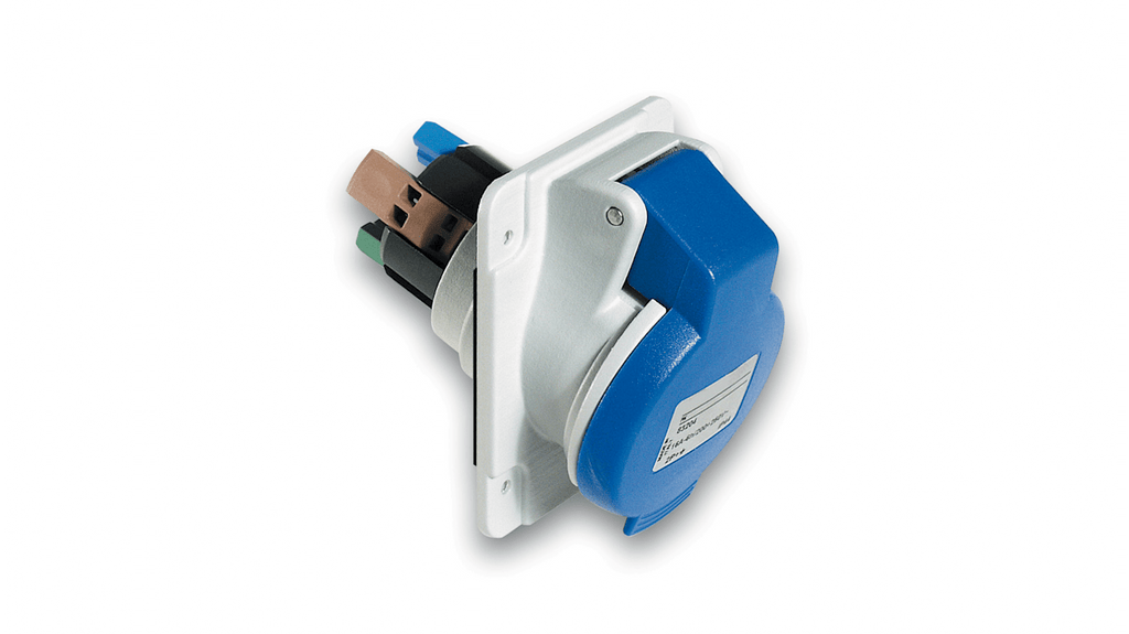 Contenitore connettore maschio per montaggio su cavo, corrente nominale 32A, tensione nominale 200-250V, formato polo 2P + E, protezione IP44, orientamento ad angolo retto, raccordo snap-on senza spelatura, pressacavo autocentrante con serracavo integrato, prodotto Green Premium, privo di mercurio, serie PKY.