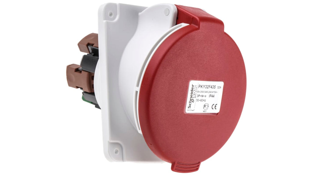 Connettore di alimentazione industriale femmina, 3P + N + E, corrente nominale 32A, tensione nominale 415 V, montaggio a pannello, presa femmina inclinata, protezione IP44, colore rosso, serie PratiKa, ad innesto, senza spelamento dei fili, adatto per molteplici applicazioni industriali.