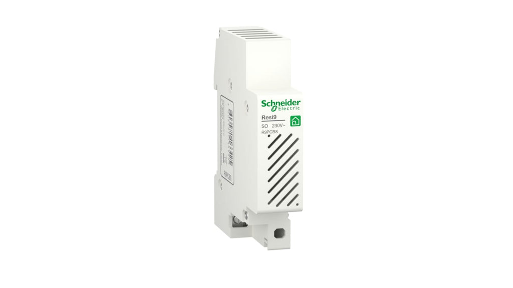 Campanello elettronico a innesto Schneider Electric, tensione di alimentazione 230 V c.a., grado di protezione IP20 e IP40, segnalazione acustica 80 dB a 1 metro, montaggio a clip, un tono. Installazione semplice e rapida, compatibile con cavi rigidi o flessibili, con o senza boccola. Serie Resi9.