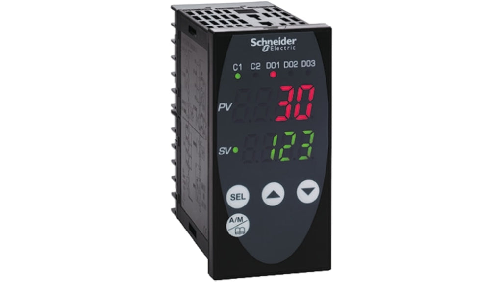 Termoregolatore PID Schneider Electric REG96, tensione di alimentazione 100 a 240 V c.a., dimensioni 96 x 48 mm, 2 uscite relè, grado di protezione IP66, temperatura operativa da -20 a +60 gradi Celsius, comunicazione Modbus integrata, display LCD a 7 segmenti, memoria flash per configurazioni, compatibile con vari sensori, installazione semplice tramite tastierino o software.