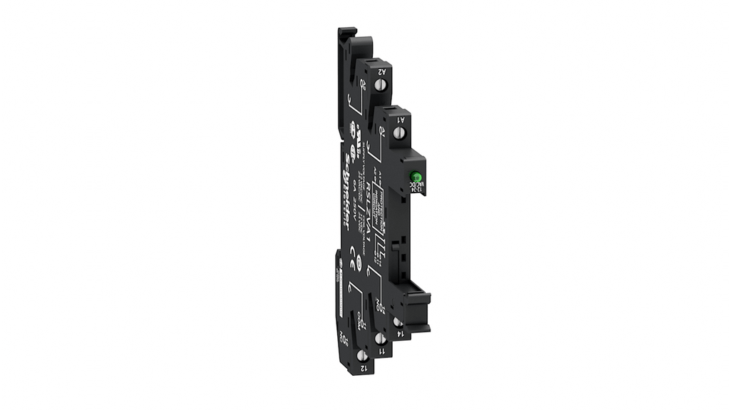 Relè d'interfaccia sottili per guida DIN. Larghezza 6 mm, tensione 48-60V ca/cc. Disponibile in versione pre-assemblata o con relè e connettori femmina individuali. Certificazione Green Premium, design modulare per ottimizzazione dello spazio. Compatibile con serie Harmony Relay RSL.