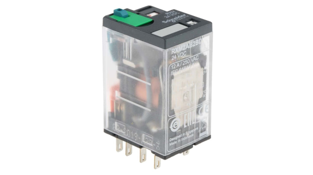 Relè di potenza DPDT con bobina a 24V cc, tipo di montaggio a innesto, corrente di commutazione 12A, potenza di commutazione massima CA 3 kVA, massima temperatura operativa +55°C, minima temperatura operativa -40°C, dimensioni 21mm x 27mm x 47.7mm, lega di argento per il materiale contatto, vita utile 100000 cicli, conforme a CE, CSA, EN/IEC, GOST, Lloyd's, REACH, Conformità RoHS, UL.
