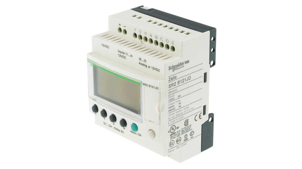 Modulo logico Schneider Electric per automazione, 8 ingressi, 4 uscite, tensione 24 V c.c., compatibile con linguaggi di programmazione FBD, Ladder Logic, SFC. Dimensioni 71,2 x 107,6 x 59,5 mm, montaggio su guida DIN, intervallo di temperatura operativa da -20 a +55 gradi Celsius, interfaccia di programmazione tramite computer o pannello operativo, display incluso. Codice costruttore SR2B121JD.