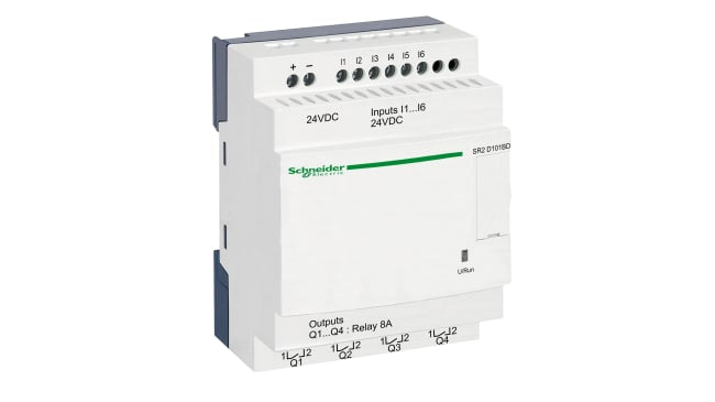 Modulo logico Schneider Electric per automazione, 6 ingressi, 4 uscite relè, tensione di alimentazione 24 V c.c., dimensioni 71,2 x 107,6 x 59,5 mm, temperatura operativa da -20 a +55 gradi Celsius, montaggio su guida DIN, programmazione tramite Ladder Logic, morsetti a vite per connessione sicura, protetto contro sovratensioni. Codice costruttore SR2D101BD.