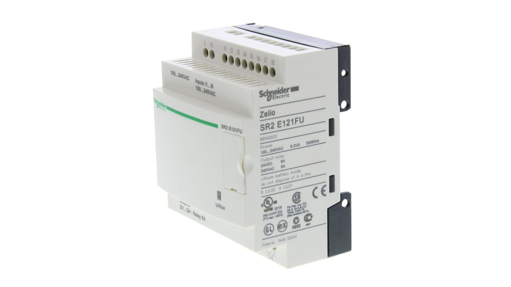 Modulo logico per guida DIN Schneider Electric Zelio Logic, 8 ingressi discreti, 4 uscite relè, tensione di alimentazione 100-240 V c.a., dimensioni 71,2 x 107,6 x 59,5 mm, temperatura operativa da -20 a +55 gradi Celsius, interfaccia di programmazione FBD e Ladder Logic, montaggio su guida DIN.