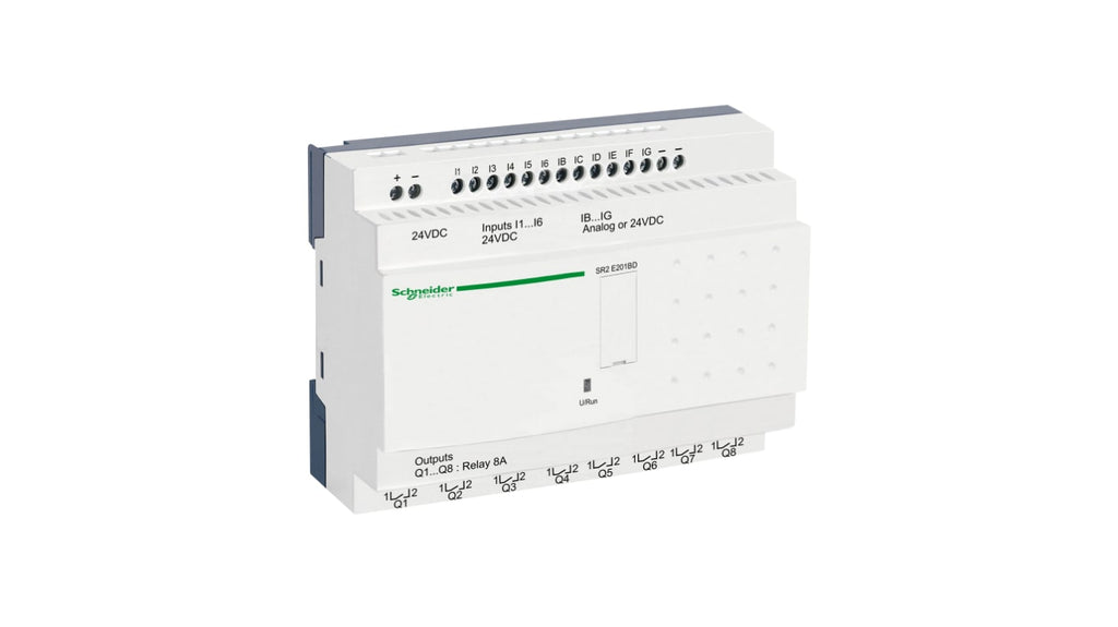 Modulo logico Schneider Electric Zelio Logic, 12 ingressi, 8 uscite, relè, alimentazione 24 V CC, ingressi analogici e discreti, interfaccia di programmazione tramite computer o pannello operativo, temperatura operativa da -20 a 40 gradi Celsius, grado di protezione IP20. Codice costruttore SR2E201BD.