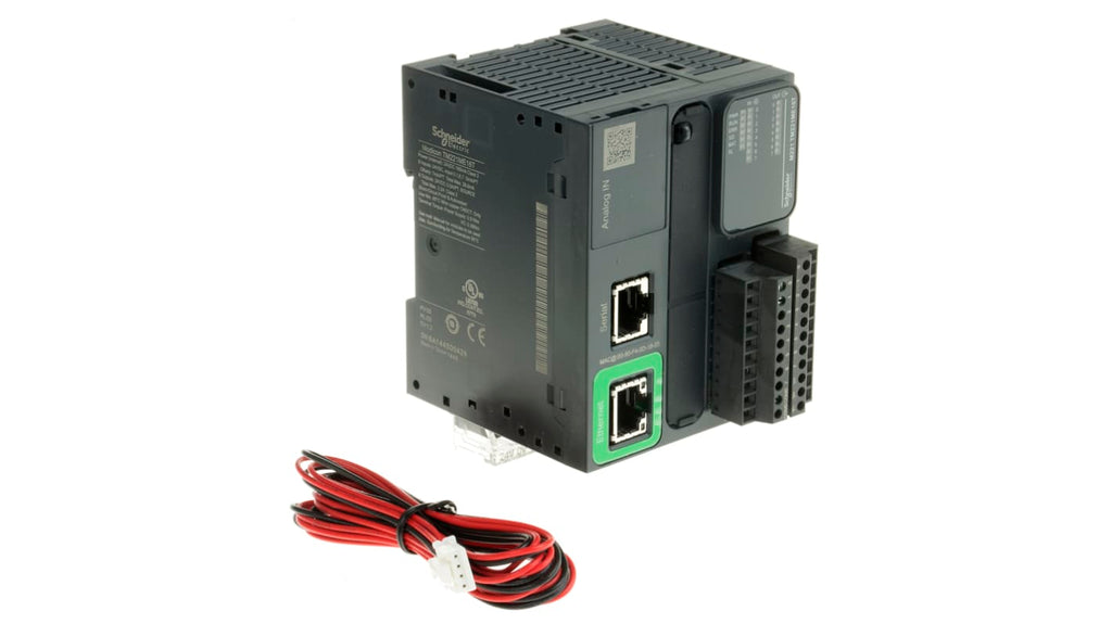 Regolatore logico Modicon M221, progettato per applicazioni di regolazione di macchine semplici, 16 I/O, 2 ingressi analogici, montaggio a pannello, interfaccia di programmazione Mini USB, programmazione con CoDeSys, capacità programma 10000 passi, slot per scheda SD, porte Ethernet e seriale, display incluso, kit incluso. Compatibile con moduli supplementari per sicurezza e servomeccanismi.