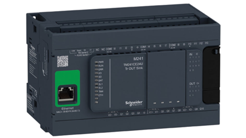 Regolatore logico Modicon M241, 14 ingressi, 10 uscite, 24 V, 128 MB memoria, comunicazione Ethernet, ModBus, PROFIBUS-DP, USB, 5 porte integrate, programmazione con SoMachineBasic, display incluso, batteria di backup, dimensioni 150 x 95 x 90 mm, montaggio su guida DIN, temperatura operativa da -10 a +55 gradi.