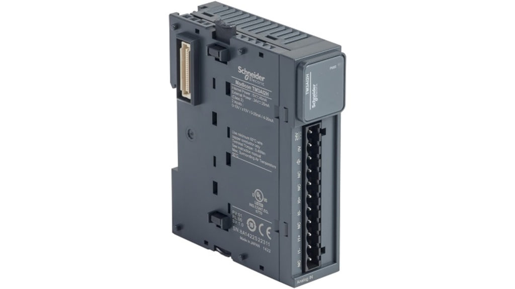Modulo I/O PLC per regolatori logici. Modulo di ingresso analogico Modicon TM3, 2 ingressi, tipo corrente e tensione, compatibile con Modicon M221, M241, M251. Dimensioni 90 x 23,6 x 70 mm, morsettiera con connettori a vite o a molla. Sistema di espansione flessibile fino a 5 metri di distanza.