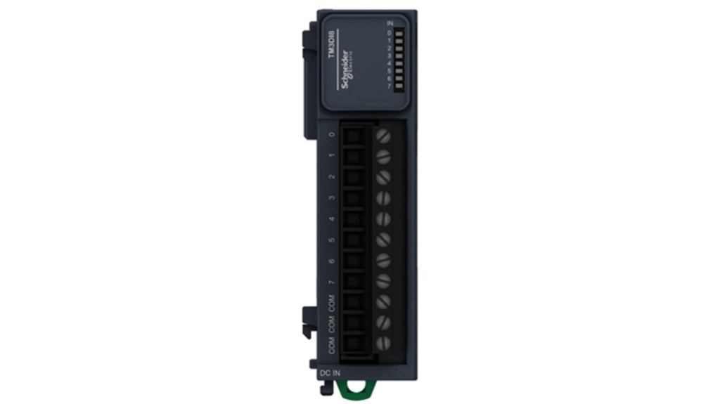 Modulo I/O PLC per regolatori logici, serie TM3, Schneider Electric. Modulo di ingresso digitale con 8 ingressi, compatibile con Modicon M221, M241 e M251. Morsettiera con connettori a vite o a molla. Dimensioni 90 x 23,6 x 70 mm. Sistema di espansione flessibile, possibilità di collegamento remoto fino a 5 metri.
