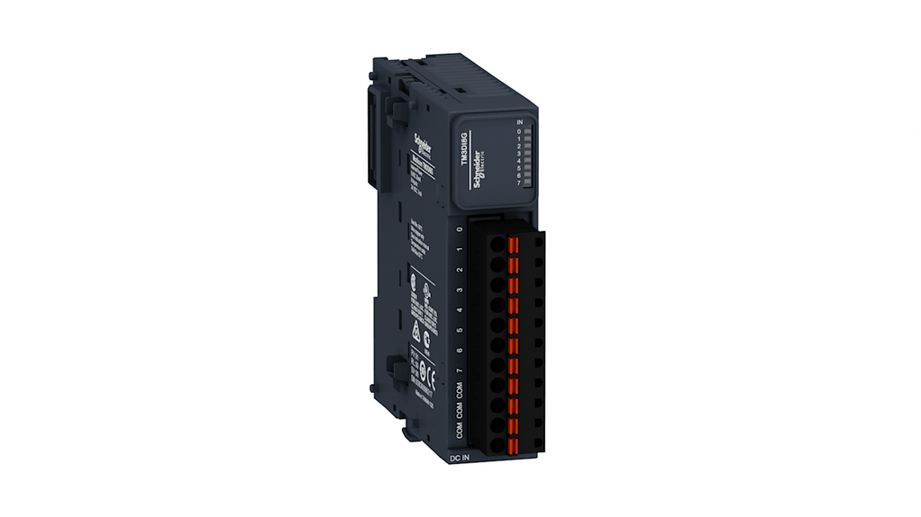 Modulo di ingresso digitale per PLC Schneider Electric, serie TM3, compatibile con Modicon M221, M241, M251, 8 ingressi, tensione nominale 24 V c.c., tempo di risposta 4 ms, grado di protezione IP40, montaggio su guida DIN, dimensioni 90 x 23,6 x 70 mm, massima temperatura operativa +55°C, resistente a scariche elettrostatiche e campi elettromagnetici, morsetti a molla per connessione senza utensili.
