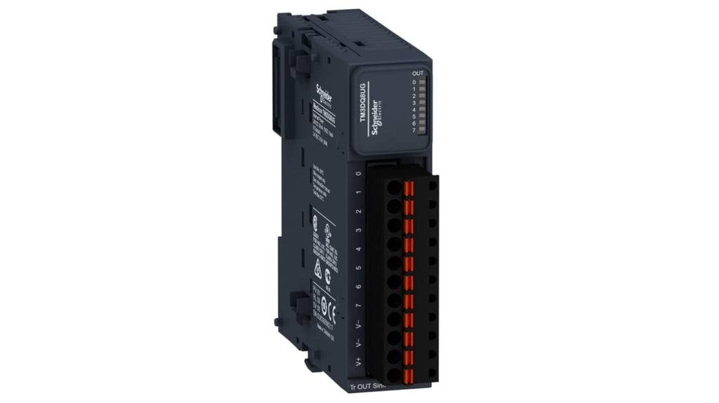 Modulo I/O PLC per regolatori logici, serie TM3, Schneider Electric. Modulo di uscita digitale con 8 uscite a transistor, corrente di uscita 500 mA. Compatibile con Modicon M221, M241 e M251. Morsettiera con connettori a vite o a molla. Dimensioni 90 x 23,6 x 70 mm. Sistema di espansione flessibile fino a 5 metri di distanza.