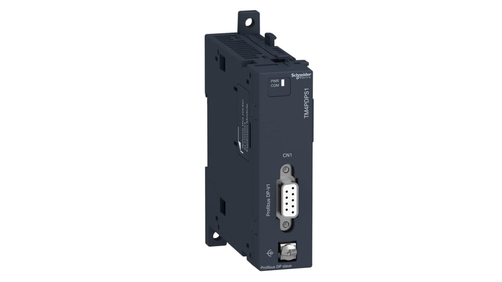 Modulo di espansione PLC per Modicon M241, slave PROFIBUS-DP. Interfaccia RS485, connettore femmina SUB-D a 9 pin, velocità di trasferimento massima 12 Mbit/s. Dotato di LED di stato verde, giallo e rosso, e vite per collegamento a terra funzionale. Prodotto da Schneider Electric, codice TM4PDPS1.