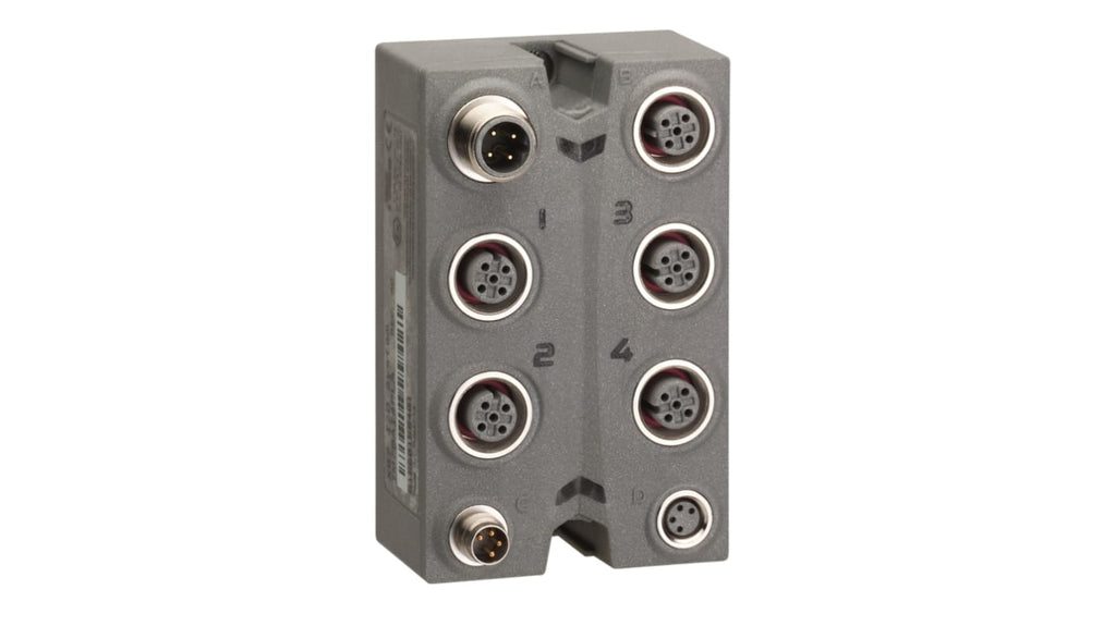 Modulo di espansione per segnali di tensione analogica, quattro canali di ingresso, risoluzione 11 bit con bit del segno, connettori M12, grado di protezione IP67, alimentazione 24 V c.c. con capacità 500 mA, protezione contro sovraccarichi, cortocircuiti e inversione di polarità, senza PVC, senza mercurio, conforme a RoHS, senza metalli pesanti tossici, resistenza a vibrazioni e urti. Compatibile con Modicon LMC058 e Modicon M258.