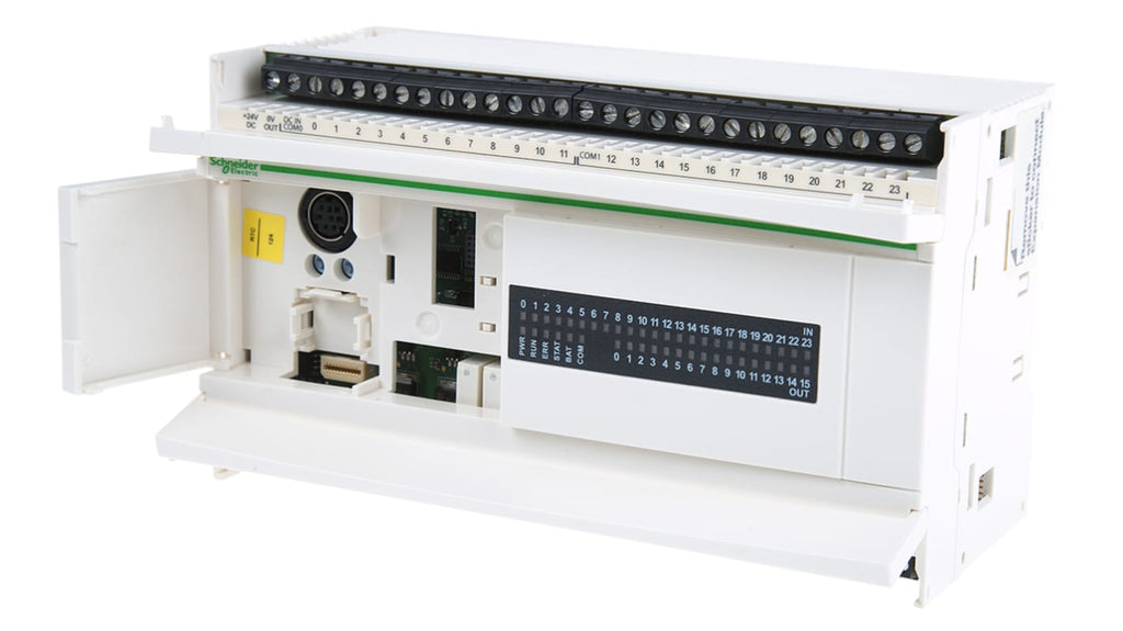 Controllore compatto Twido Schneider Electric, 24 ingressi 24 V c.c., 16 uscite isolate (2 A a 250 V c.a. per relè, 0,3 A a 24 V c.c. per transistor), porta di programmazione RS-485, dimensioni 90 x 157 x 70 mm, montaggio su guida DIN, temperatura operativa da 0 a 50 gradi Celsius, conforme a IEC61131-2, UL1604/CSA C22.2 N° 213, CE e TÜV.
