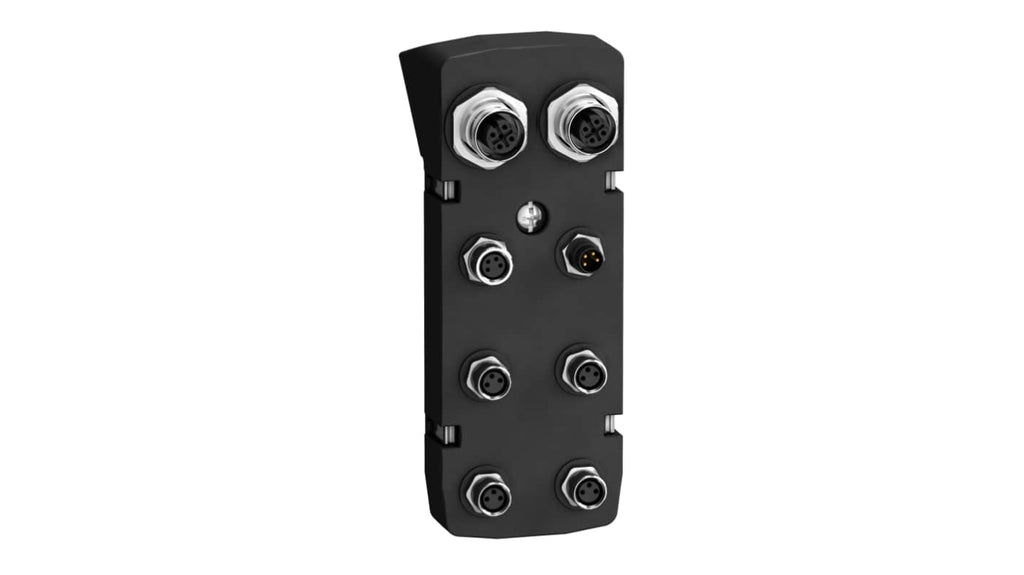 Modulo di collegamento per controllo servoassistito Schneider Electric, serie LEXIUM32I, con funzione di sicurezza STO integrata. Supporta opzioni per CANopen/CANmotion e EtherCAT. Connessione tramite connettori industriali M8 e M12. Include 2 funzioni STO e 2 o 4 ingressi logici. Temperatura operativa da 0 a 50 gradi Celsius. Regolatore di corrente, posizionamento e velocità. Codice costruttore VW3M9206.