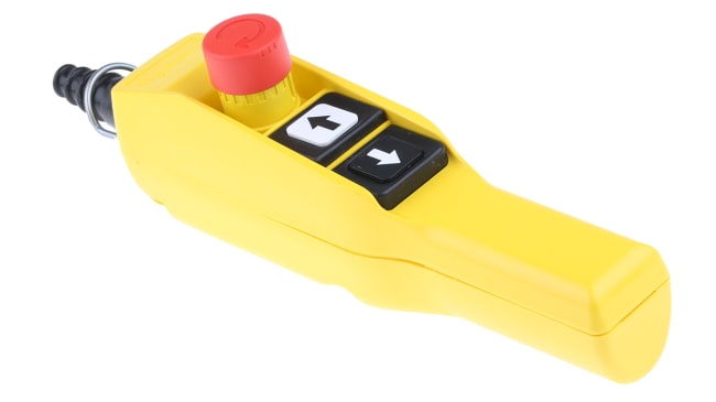Stazione pensile a pulsante DPDT, Schneider Electric, serie XACA. Custodia in materiale termoplastico a doppio isolamento, protezione IP65, resistenza agli urti e alla corrosione. Configurazione contatto DPDT, corrente massima 3A, tensione nominale 600V. Operatività da -25°C a +70°C, colore contenitore giallo, tre pulsanti con marcature freccia in giù, E-Stop, freccia in su. Tipo terminale a vite.