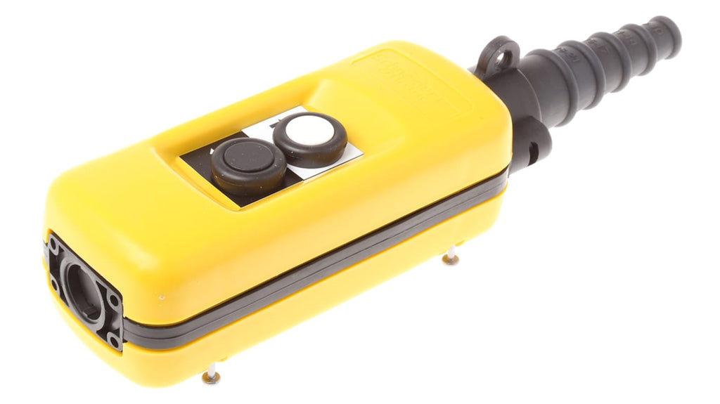 Stazione pensile a pulsante, 2 NA/2 NC, Schneider Electric. Custodia di copertura per pulsante interno, pre-assemblato, pronto all'uso. Doppio isolamento, meccanicamente interbloccato. Corrente massima 3A, tensione nominale 600V, protezione IP65. Range temperatura operativa -25°C/+70°C. Colore contenitore giallo, pulsanti nero e bianco con marcatura freccia in giù e freccia in su. Tipo terminale a vite.