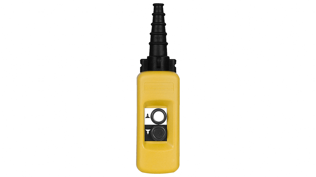 Stazione pensile a pulsante, 1 NC + 2 NA, marchio Schneider Electric. Protezione IP65, tensione nominale 600V, corrente massima 10A. Configurazione contatto 1 NC + 2 NA, tipo terminale a vite. Colore contenitore giallo, colore pulsante bianco, numero di pulsanti 2. Prodotto Green Premium, privo di mercurio, sbraccio senza SVHC.