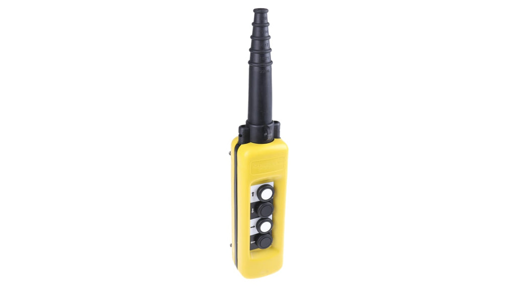 Stazione pensile a pulsante per applicazioni industriali, 4 contatti normalmente aperti, protezione IP65, tensione nominale 600V, corrente massima 3A, temperatura operativa da -25 a +70 gradi Celsius, custodia gialla, pulsanti neri e bianchi con marcature freccia in giù, sinistra, destra e su, tipo di terminale a vite, pre-assemblata e pronta all'uso, doppio isolamento, meccanicamente interbloccata tra coppie.