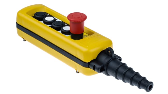 Stazione pensile a pulsante per il funzionamento remoto di sollevatori a motore singolo, configurazione 4 NA + 3 NC, tensione massima 600V, corrente massima 3A, grado di protezione IP65, temperatura operativa da -25°C a +70°C, cinque pulsanti con marcature per funzioni di movimento, pulsante di arresto di emergenza rosso, terminali a vite, esterno in polipropilene giallo. Codice costruttore XACA47131, marchio Schneider Electric.