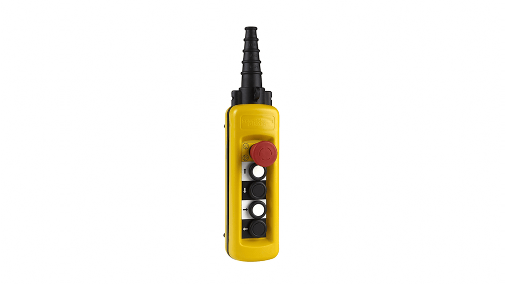 Interruttore pensile SPDT, 3 posizioni, per il controllo di motori di sollevamento a velocità singola. Involucro in polipropilene giallo, 4 pulsanti e 1 arresto di emergenza, grado di protezione IP65 e IK08, conforme a standard EN/IEC e UL. Codice costruttore: XACA48131, marchio: Schneider Electric.