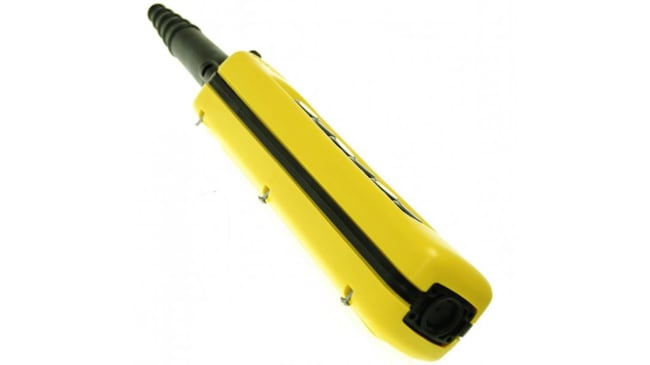 Stazione pensile a pulsante, 6NA, Schneider Electric. Interruttore meccanico per controllo a distanza, pre-assemblato, pronto all'uso. Doppio isolamento, protezione IP65, temperatura operativa da -25 a +70 gradi Celsius. Tensione nominale 600V, configurazione contatto 6NA, terminale a vite. Colore contenitore giallo, sei pulsanti con marcature direzionali, pulsanti neri e bianchi.