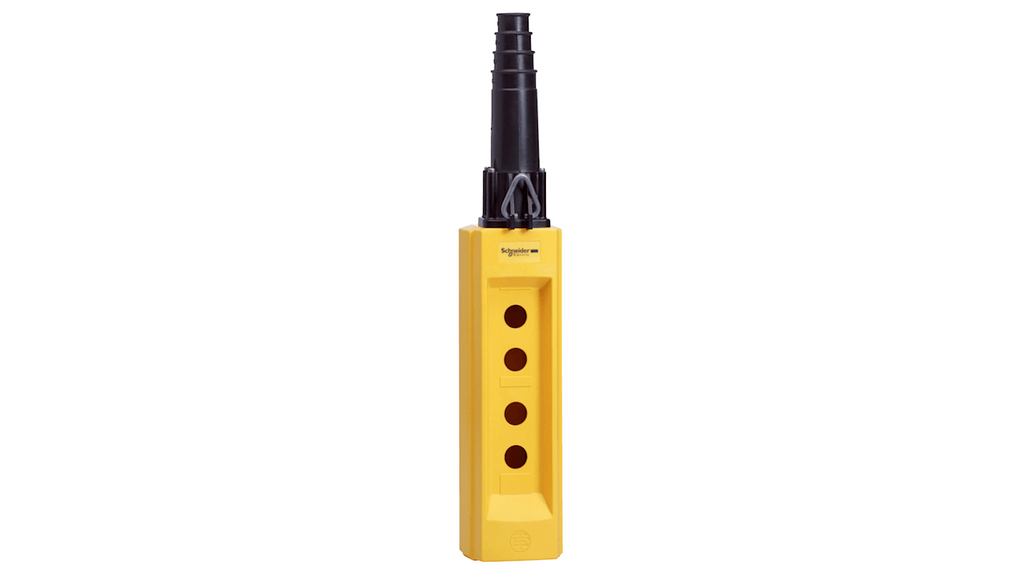 Stazione pensile a pulsante, codice costruttore XACB04, marchio Schneider Electric, contenitore in lega di alluminio, resistenza a urti e vibrazioni secondo IEC 68-2-6, pulsanti metallici grandi montati a filo, morsetto di collegamento a terra accessibile, protezione IP65, temperatura operativa da -25 a +70 gradi Celsius, colore giallo.