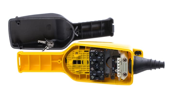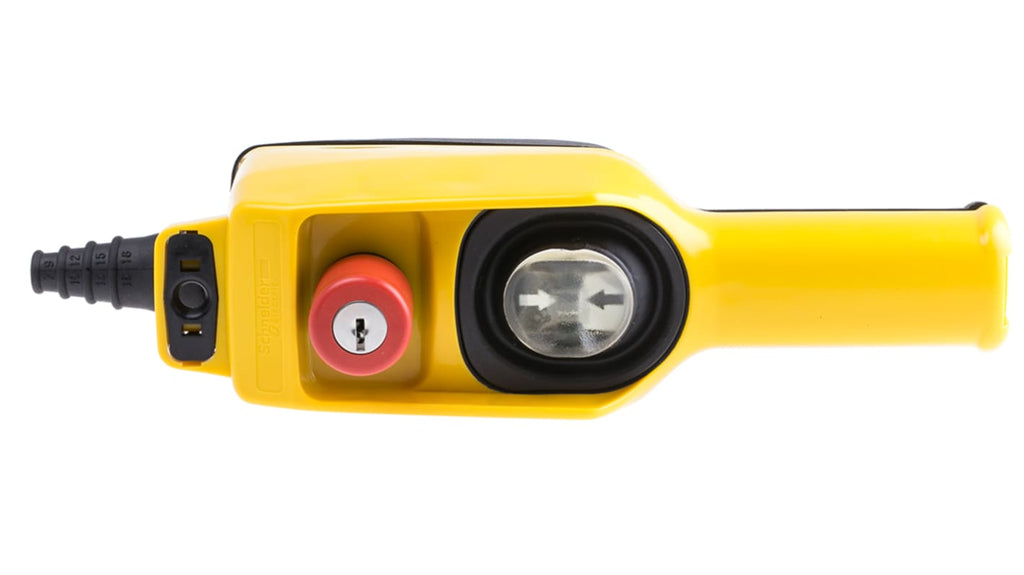 Stazione pensile a pulsante per il controllo di motori di sollevamento, Schneider Electric, codice XACD23A0105. Pulsantiere a comando intuitivo, arresto di emergenza con rilascio a chiave, protezione IP65, involucro in polipropilene giallo e nero. Range di temperatura operativa -25 a +70 gradi Celsius, blocchi a doppio contatto 10 A, tensione di isolamento 600 V, forza di azionamento 16 N. Normative IEC 337-1, NFC 63-140, VDE 0660 parte 2, IEC 158-1.