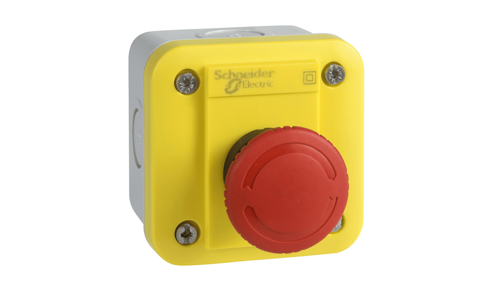 Stazione di controllo per spegnimento di emergenza, modello XAL-E di Schneider Electric, struttura in ABS, grado di protezione IP54, 1 pulsante a fungo NC, attuazione a pulsante ad aggancio, diametro pulsante 22 mm, colore rosso, funzionamento dei contatti a interruzione lenta, design compatto con opzioni di ingresso cavi, peso 0,11 kg, marchio CE con apertura positiva.