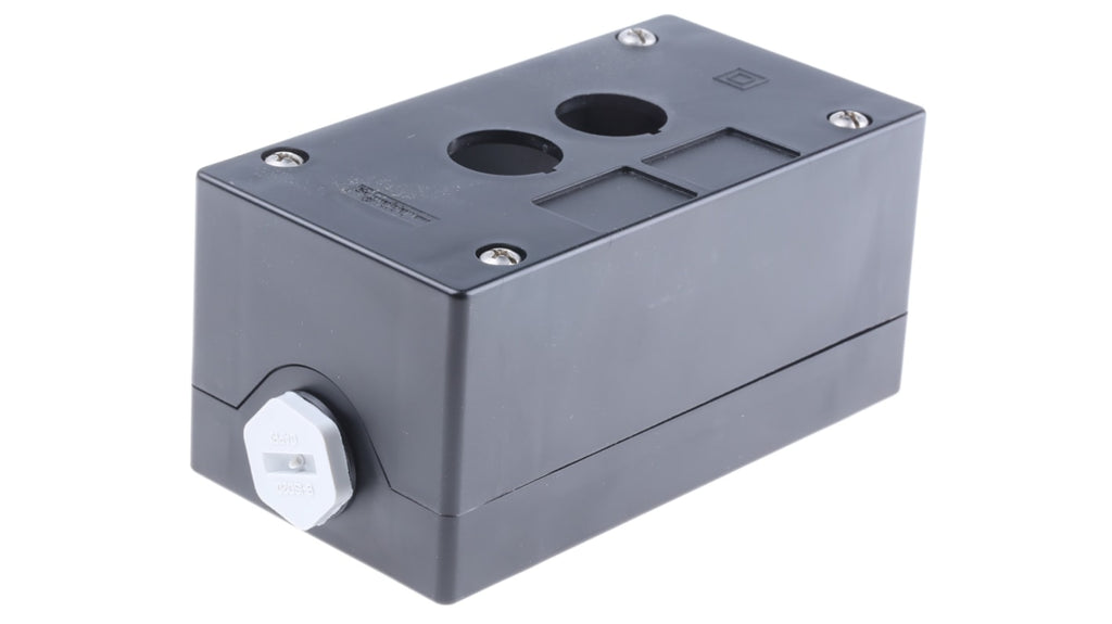 Scatola per pulsante in plastica per ambienti difficili, 2 fori da 22 mm, grado di protezione IP 66 e IP 69K, colore nero, materiale plastico, massima temperatura operativa +70°C, superficie liscia per facile pulizia, coperchio fissato con quattro viti prigioniere in acciaio inossidabile, progettata per l'uso con selettori e interruttori a chiave senza piastra antirotazione. Codice costruttore XALG02, marchio Schneider Electric.