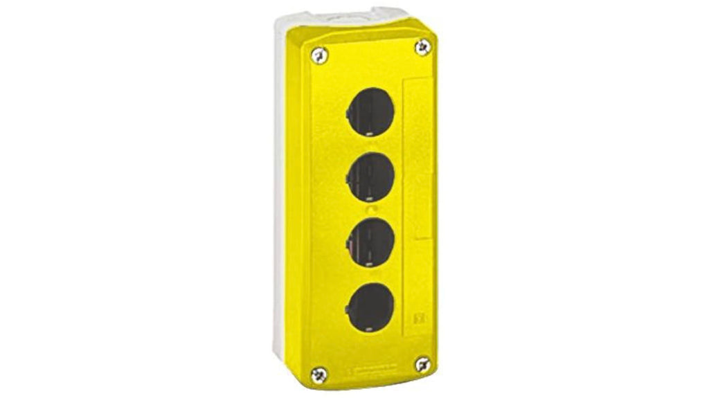 Scatola per pulsante, 4 fori, Ø 22mm, serie Harmony XALK di Schneider Electric. Materiale plastico, colore giallo, montaggio a filo. Massima temperatura operativa +70°C. Grado di protezione IP65, conforme a IEC 60529, NEMA 4. Compatibile con unità di controllo e segnalazione della gamma Harmony XB5. Certificazioni CE, UL, CSA.